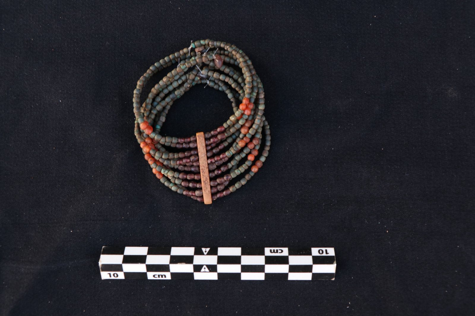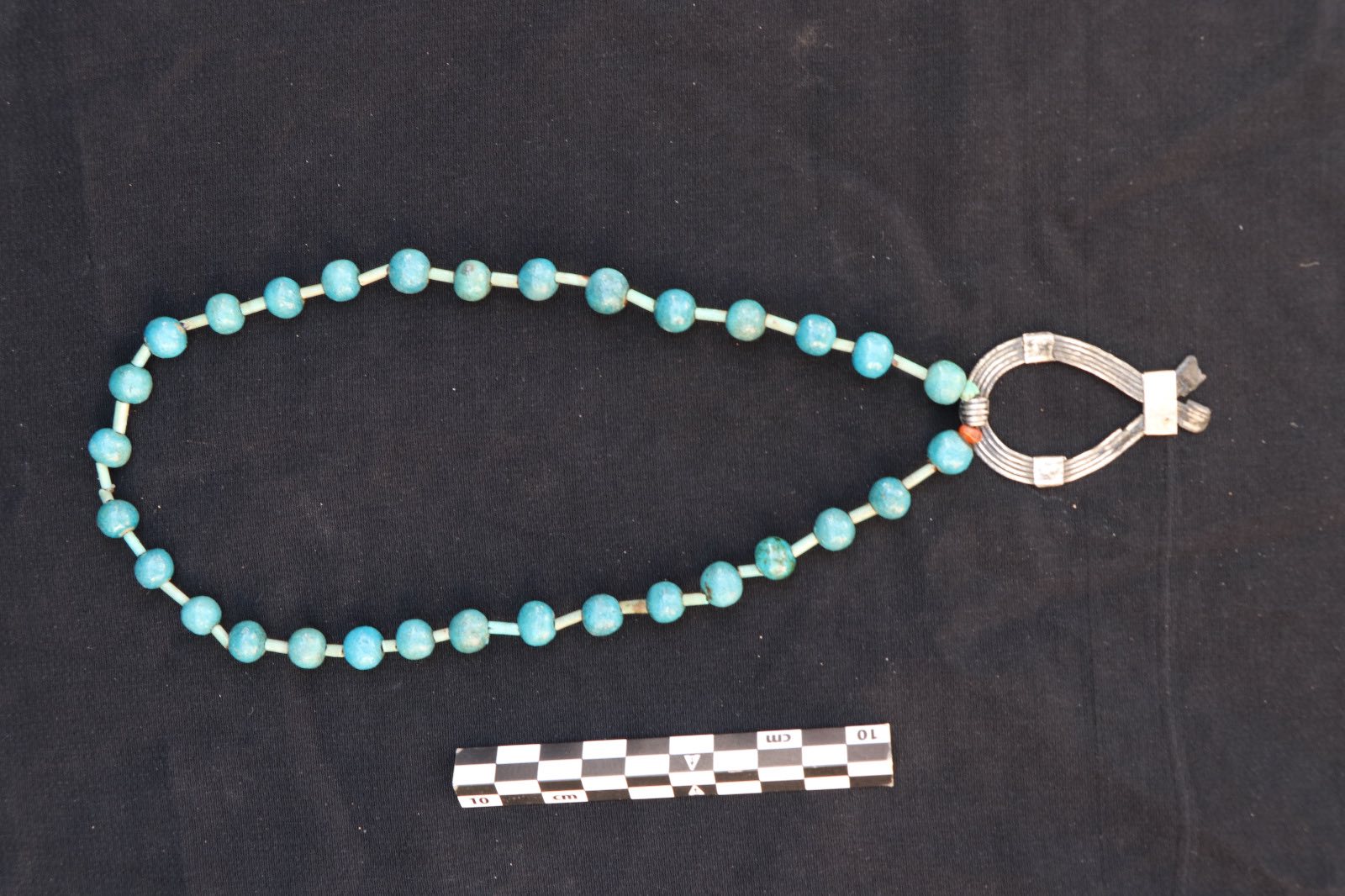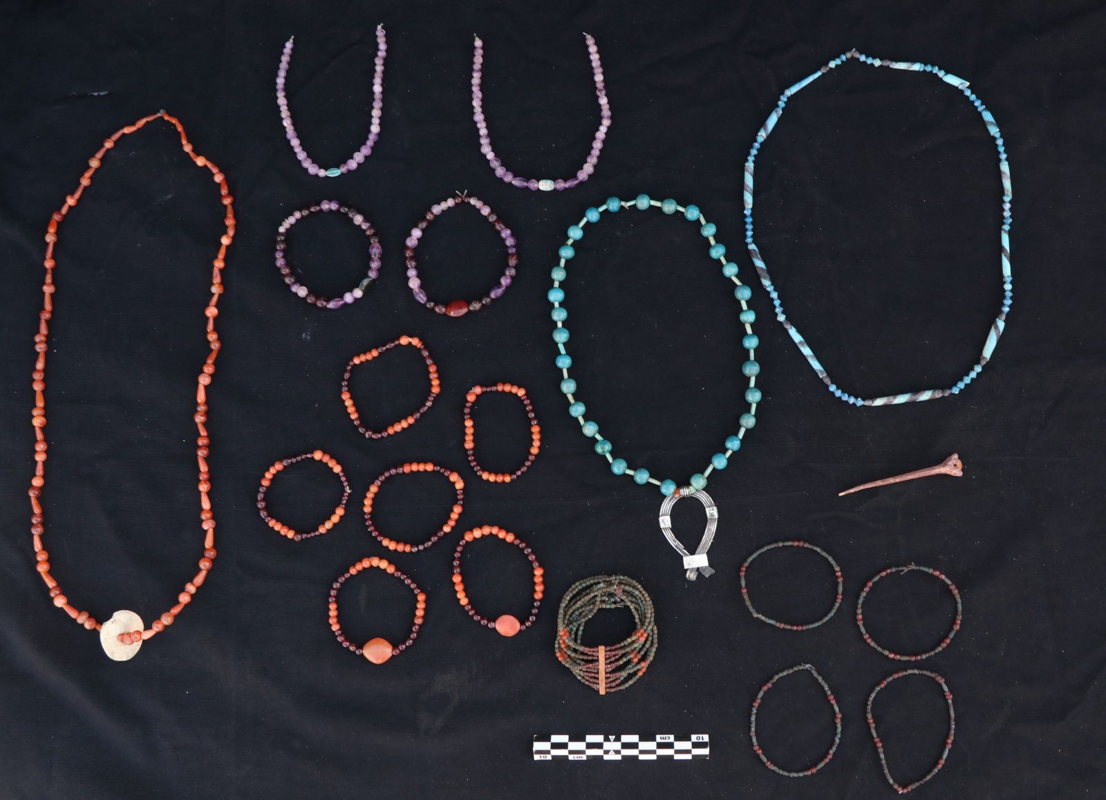 En el patio exterior de las tumbas se halló además un conjunto de objetos de adorno, entre ellos espejos de bronce, recipientes de alabastro para cosméticos, collares de cuentas de variados colores y formas, así como diversos amuletos datados en el Reino Medio.