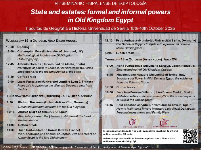 organizado en el marco del proyecto financiado por el Plan Propio de la Universidad de Sevilla, Proyecto VIIPPIT-2023-II.5 “State and estates: formal and informal powers in Old Kingdom Egypt», dirigido por la Dra. Sánchez Casado.